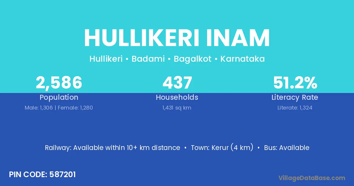 Hullikeri Inam village has a total population of 2,586 people, of which 1,306 are males and 1,280 are females.
