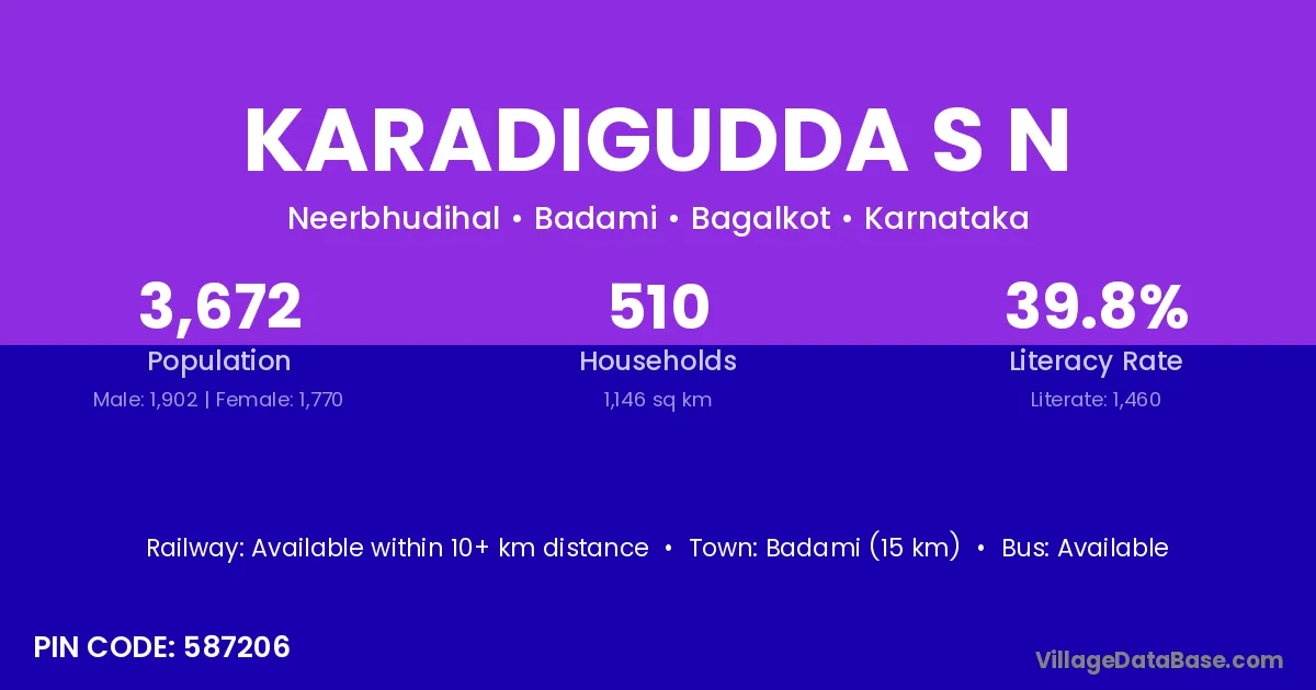 Badami (15 km) is the nearest town to Karadigudda S N village for major economic activities and is located approximately 15 km away.