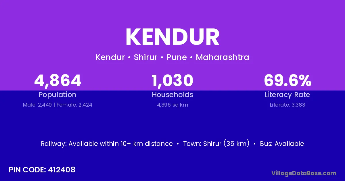 The literacy rate of Kendur village is 55.78%. Male literacy stands at 66.41% and female literacy at 45.03%.