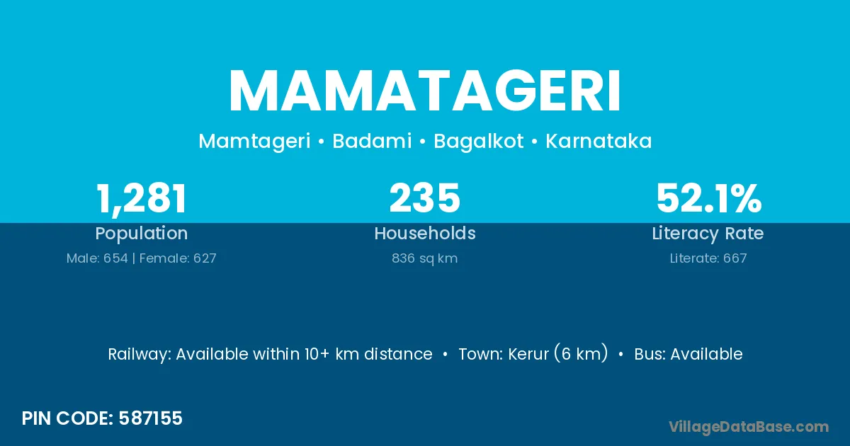 Kerur (6 km) is the nearest town to Mamatageri village for major economic activities and is located approximately 6 km away.