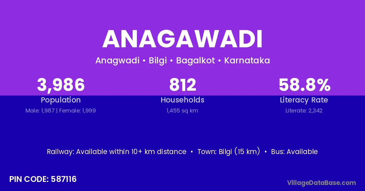 Anagawadi village has a total population of 3,986 people, of which 1,987 are males and 1,999 are females.