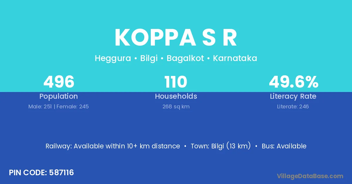 Bilgi (13 km) is the nearest town to Koppa S R village for major economic activities and is located approximately 13 km away.