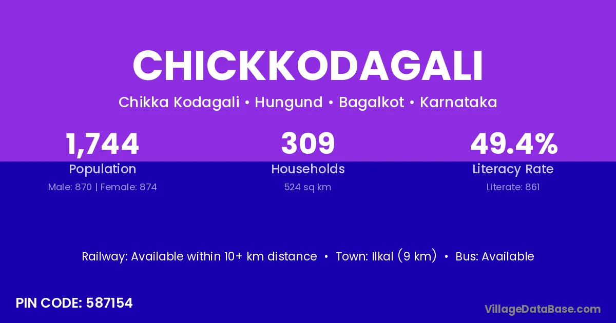 Ilkal (9 km) is the nearest town to Chickkodagali village for major economic activities and is located approximately 9 km away.