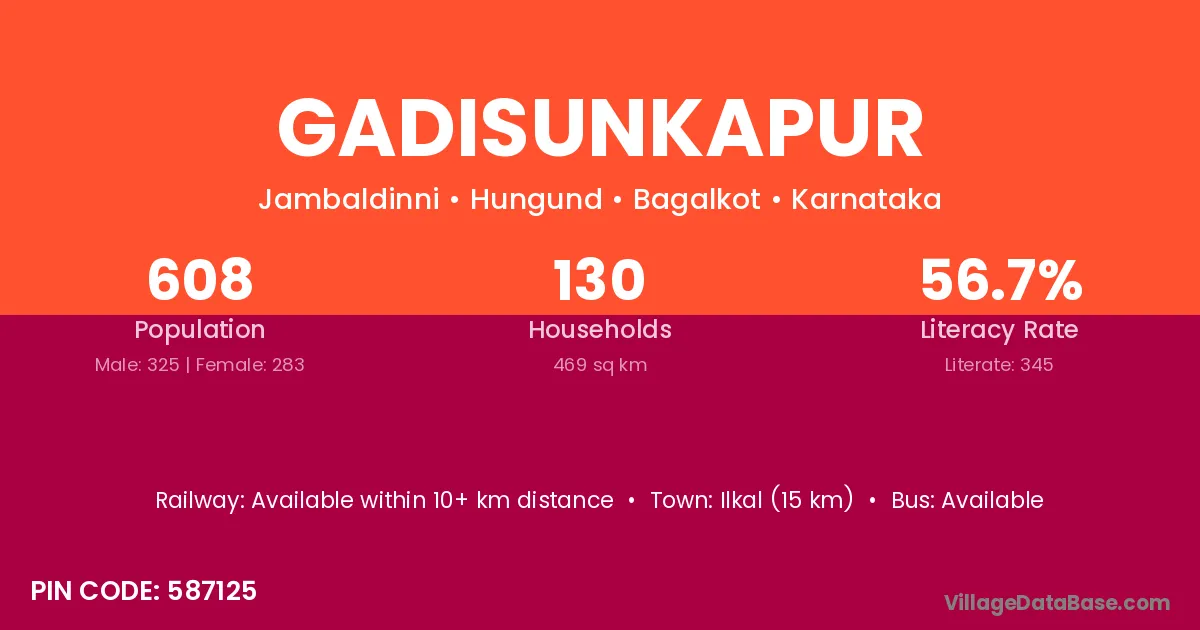Ilkal (15 km) is the nearest town to Gadisunkapur village for major economic activities and is located approximately 15 km away.