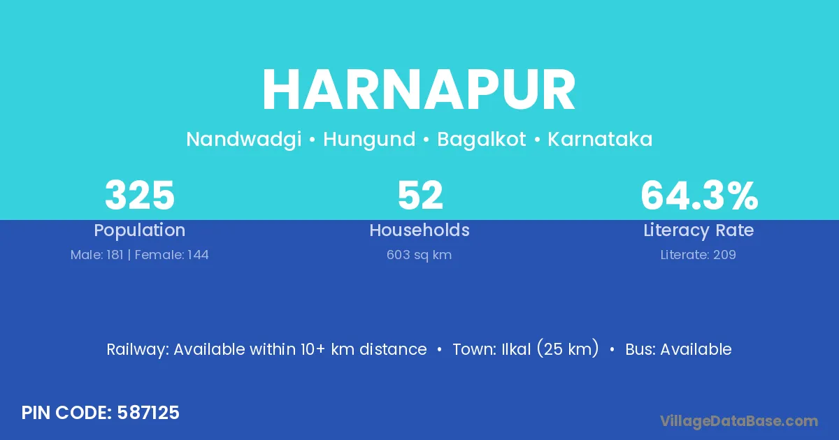 Ilkal (25 km) is the nearest town to Harnapur village for major economic activities and is located approximately 25 km away.