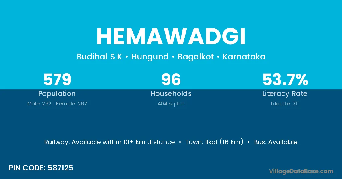 Ilkal (16 km) is the nearest town to Hemawadgi village for major economic activities and is located approximately 16 km away.