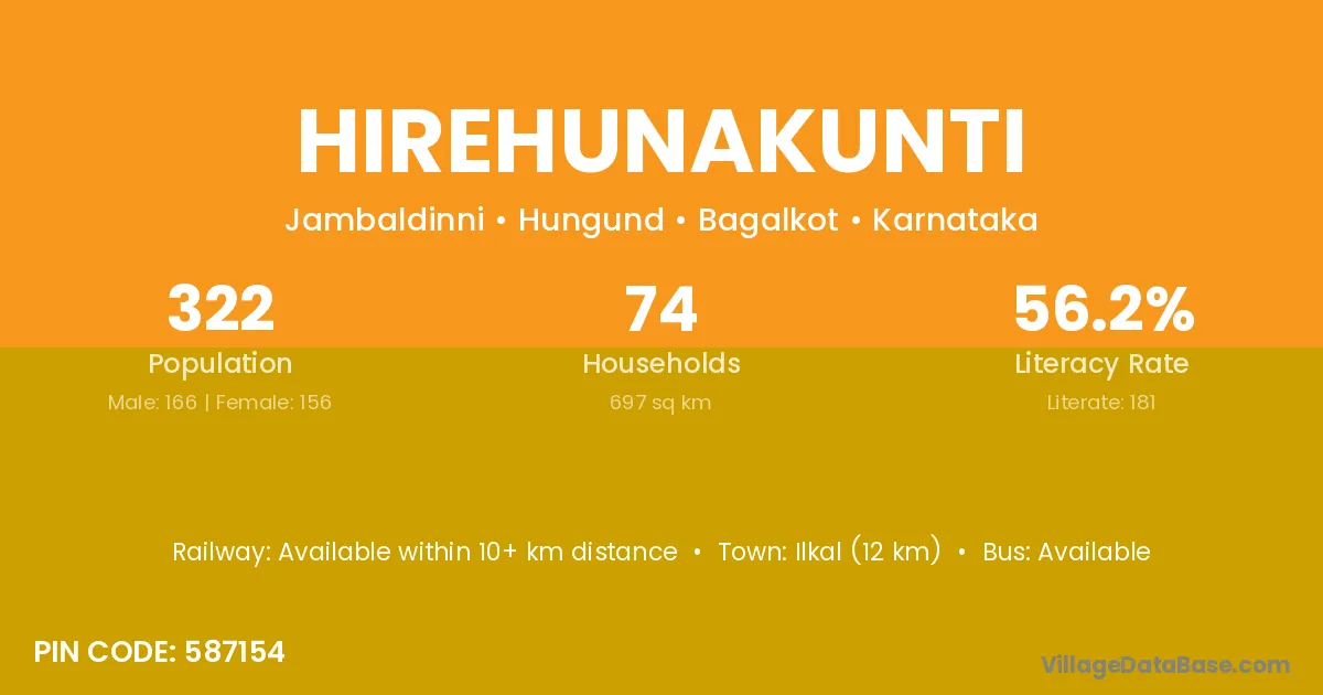 Ilkal (12 km) is the nearest town to Hirehunakunti village for major economic activities and is located approximately 12 km away.