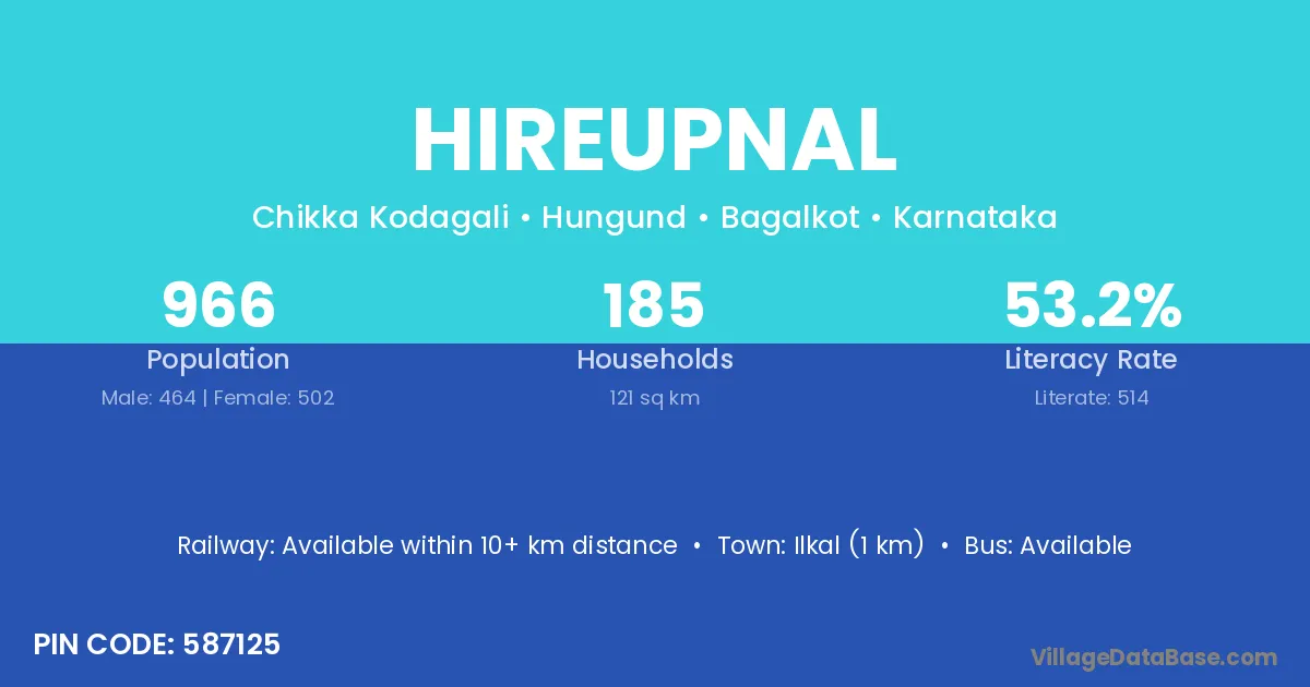 Ilkal (1 km) is the nearest town to Hireupnal village for major economic activities and is located approximately 1 km away.