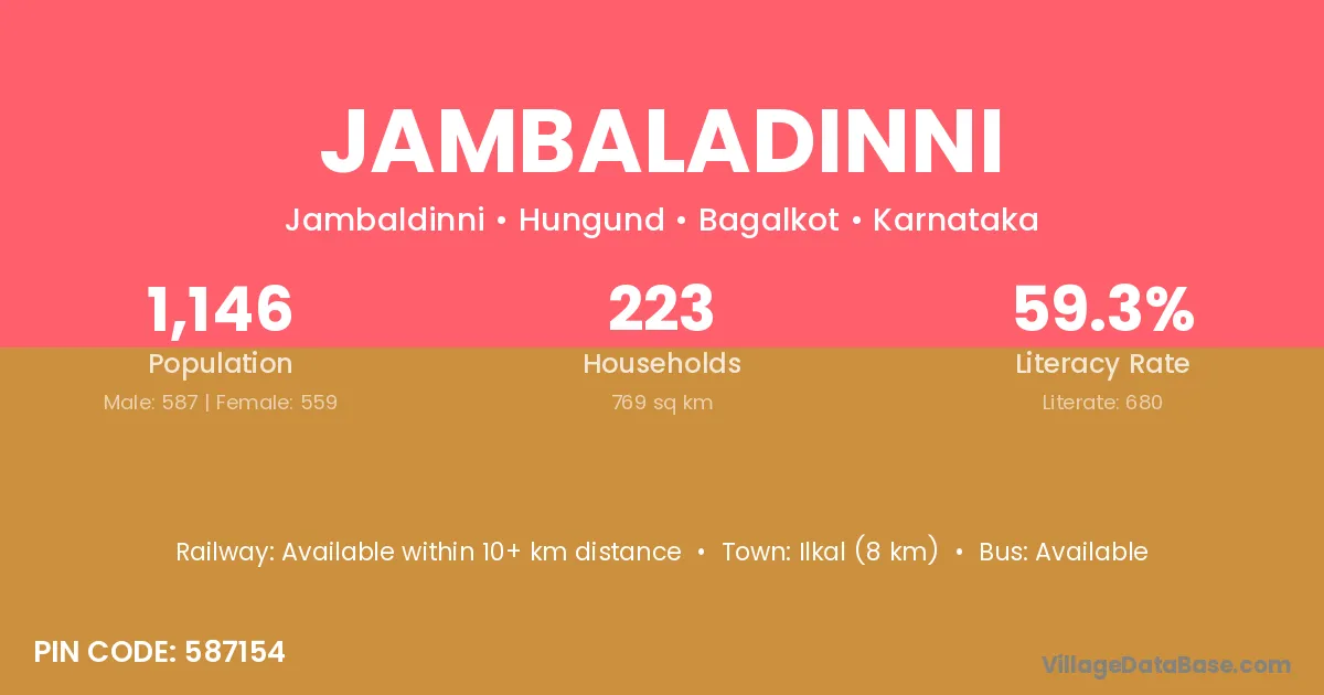 Ilkal (8 km) is the nearest town to Jambaladinni village for major economic activities and is located approximately 8 km away.