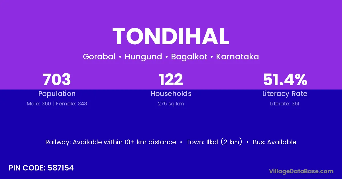 Ilkal (2 km) is the nearest town to Tondihal village for major economic activities and is located approximately 2 km away.