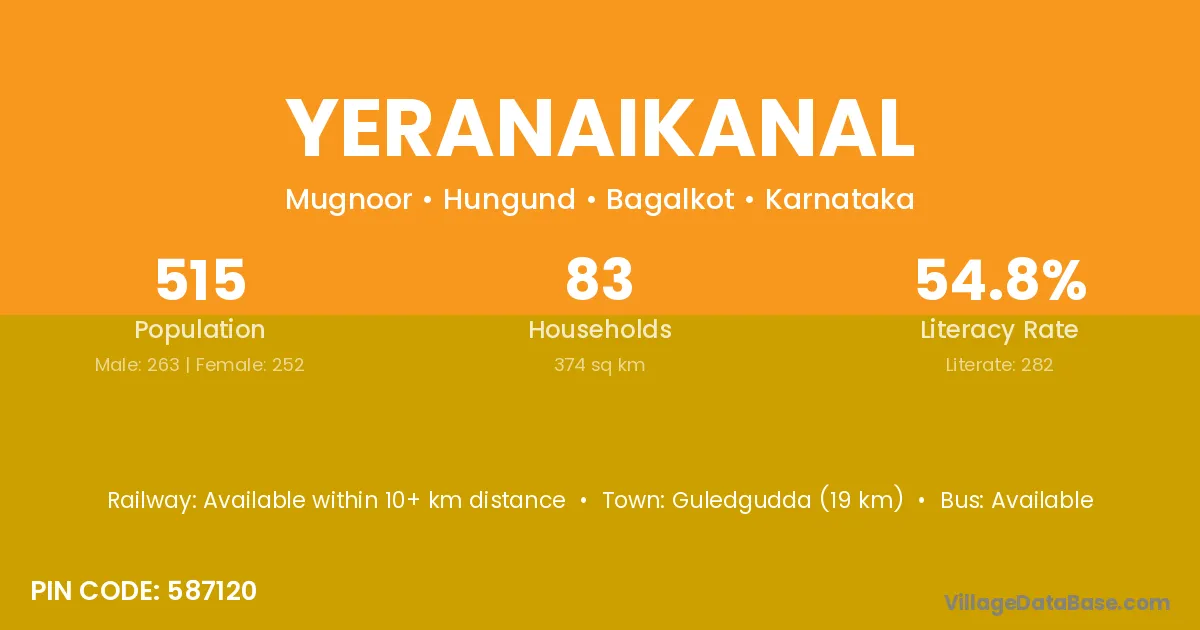 Guledgudda (19 km) is the nearest town to Yeranaikanal village for major economic activities and is located approximately 19 km away.