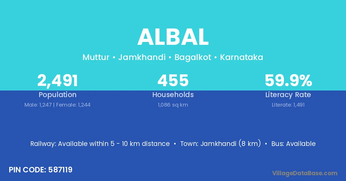 Jamkhandi (8 km) is the nearest town to Albal village for major economic activities and is located approximately 8 km away.