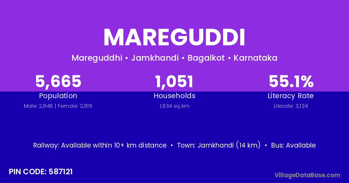 Jamkhandi (14 km) is the nearest town to Mareguddi village for major economic activities and is located approximately 14 km away.