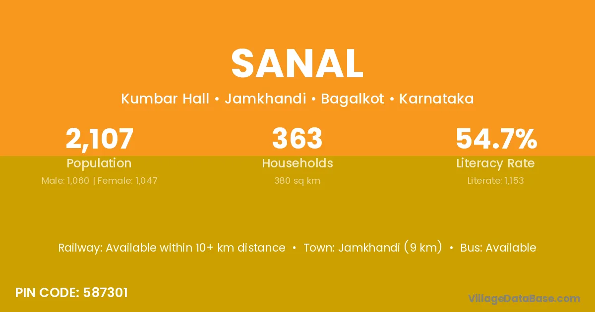 Jamkhandi (9 km) is the nearest town to Sanal village for major economic activities and is located approximately 9 km away.