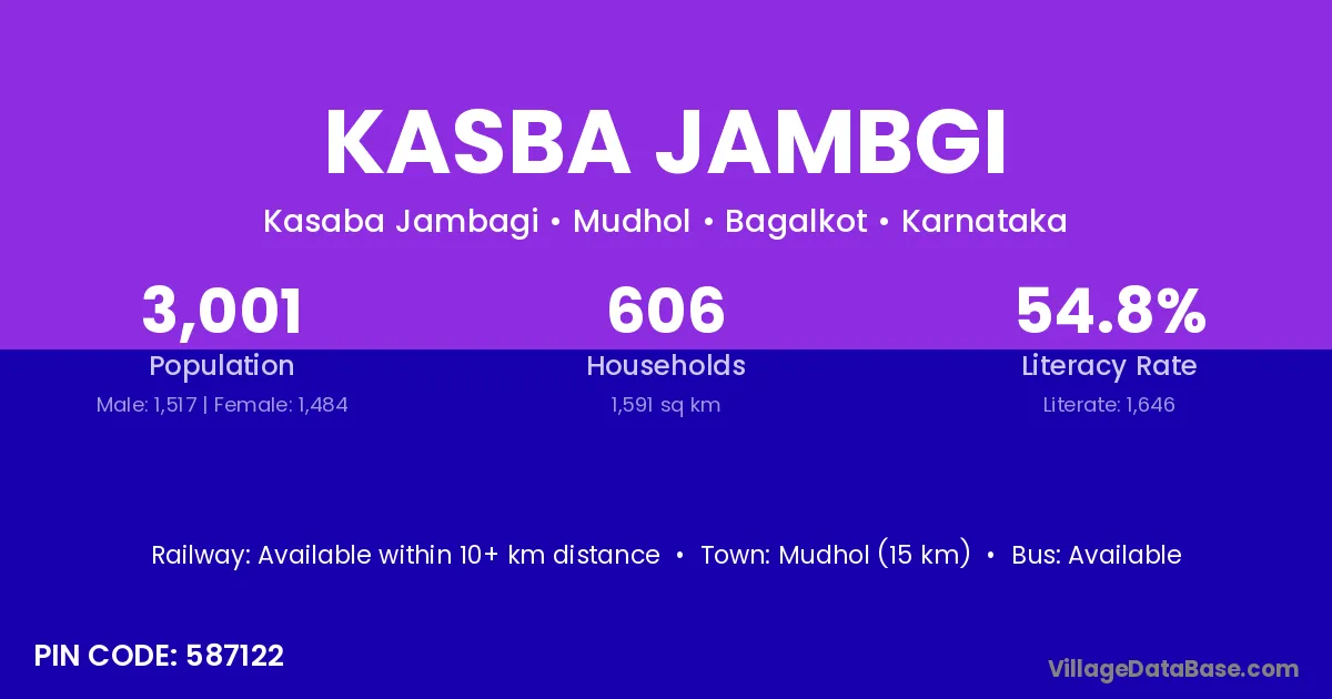 Mudhol (15 km) is the nearest town to Kasba Jambgi village for major economic activities and is located approximately 15 km away.