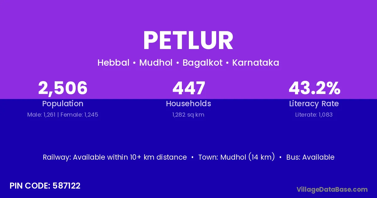 Mudhol (14 km) is the nearest town to Petlur village for major economic activities and is located approximately 14 km away.