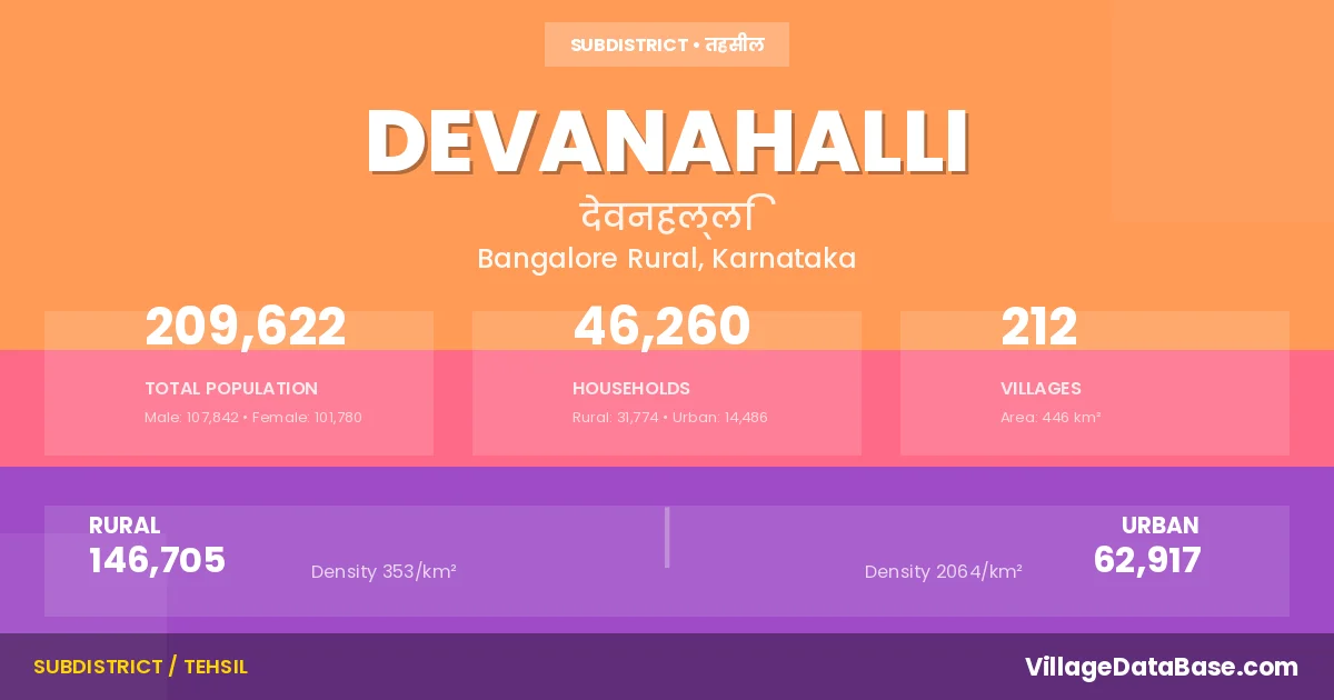 According to the 2011 census The total area of Devanahalli Taluka is 446 km², with a population of 209622 people. The population density is 470 inhabitants per square kilometre, and there are approximately 46260 houses in the sub district.