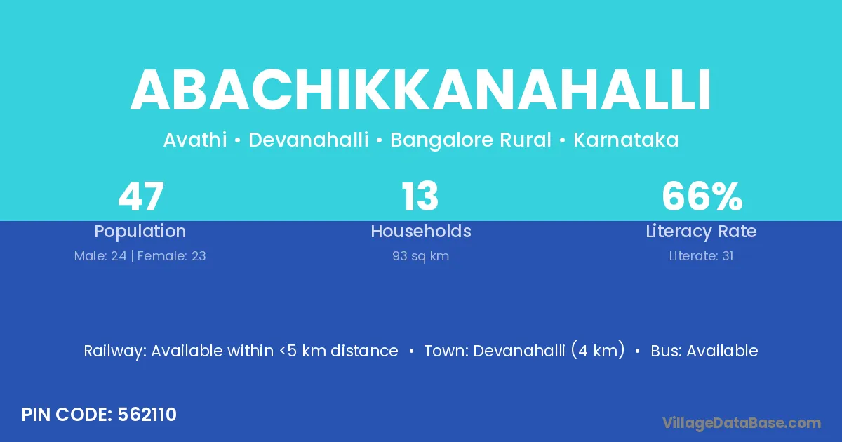 Devanahalli (4 km) is the nearest town to Abachikkanahalli village for major economic activities and is located approximately 4 km away.