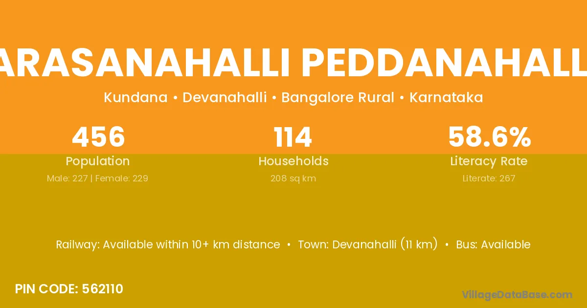 Arasanahalli Peddanahalli village has a total population of 456 people, of which 227 are males and 229 are females.