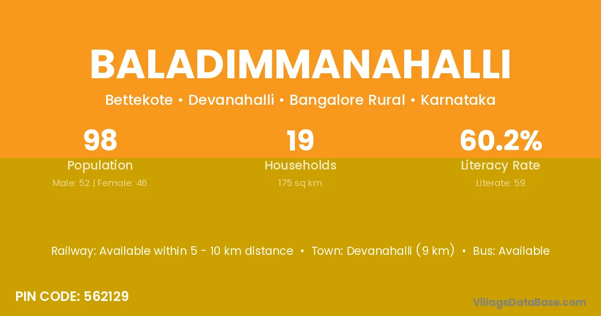 Devanahalli (9 km) is the nearest town to Baladimmanahalli village for major economic activities and is located approximately 9 km away.