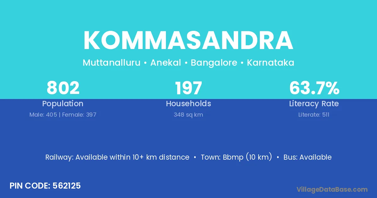 Kommasandra village has a total population of 885 people, of which 461 are males and 424 are females.