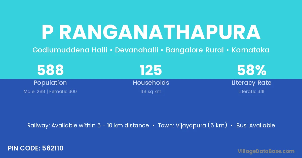 Vijayapura (5 km) is the nearest town to P Ranganathapura village for major economic activities and is located approximately 5 km away.