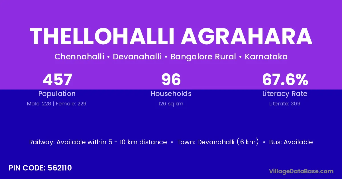 Thellohalli Agrahara village has a total population of 457 people, of which 228 are males and 229 are females.