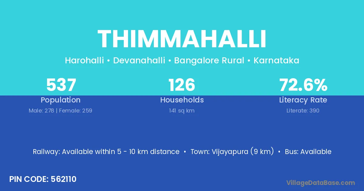 Thimmahalli village has a total population of 537 people, of which 278 are males and 259 are females.