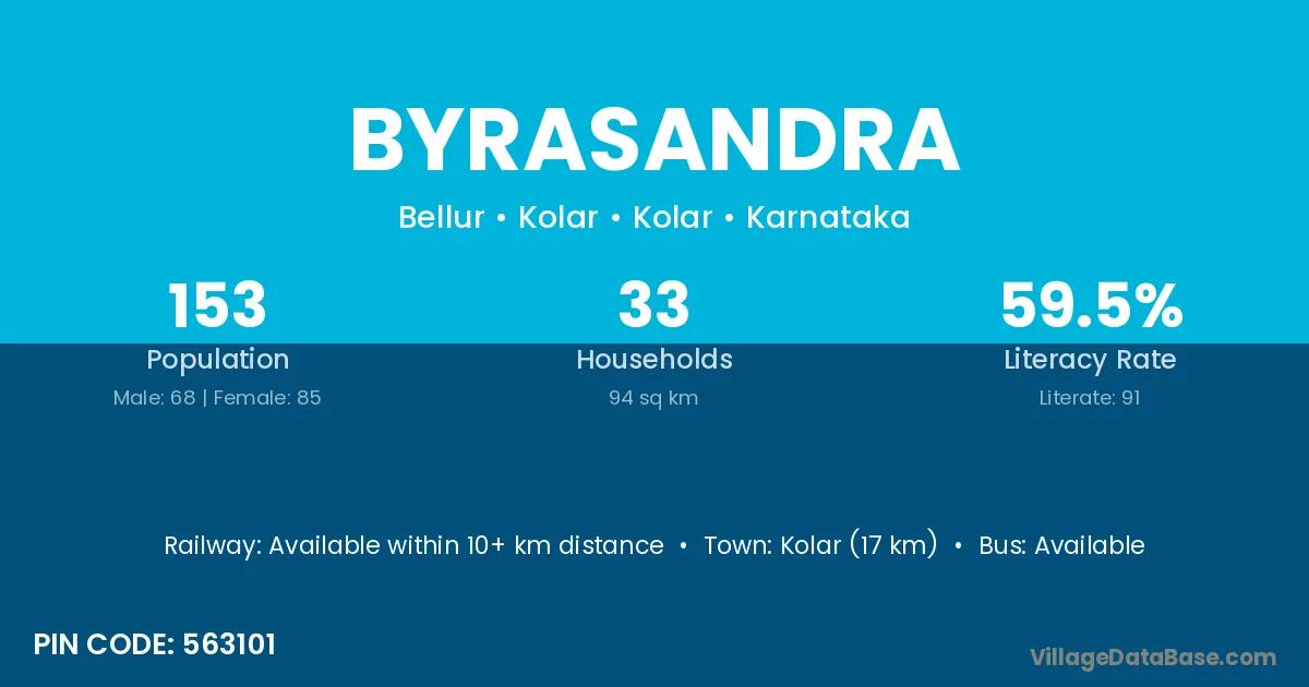 Dod Ballapur (6 km) is the nearest town to Byrasandra village for major economic activities and is located approximately 6 km away.