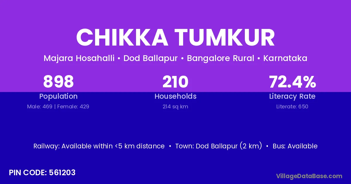 Dod Ballapur (2 km) is the nearest town to Chikka Tumkur village for major economic activities and is located approximately 2 km away.