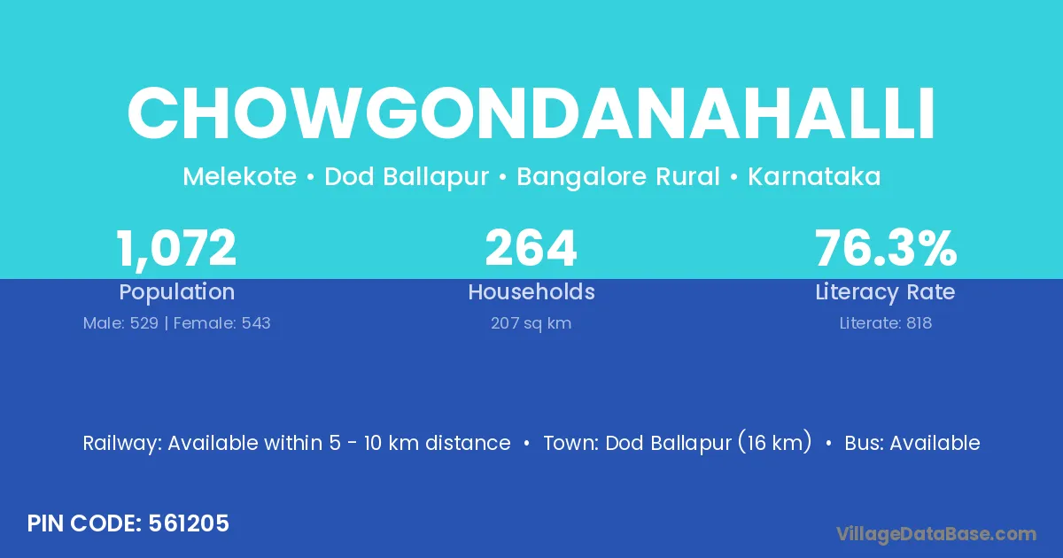 Dod Ballapur (16 km) is the nearest town to Chowgondanahalli village for major economic activities and is located approximately 16 km away.