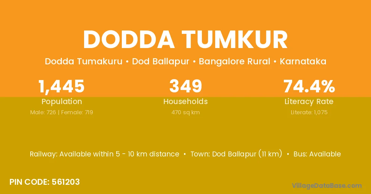 Dod Ballapur (11 km) is the nearest town to Dodda Tumkur village for major economic activities and is located approximately 11 km away.