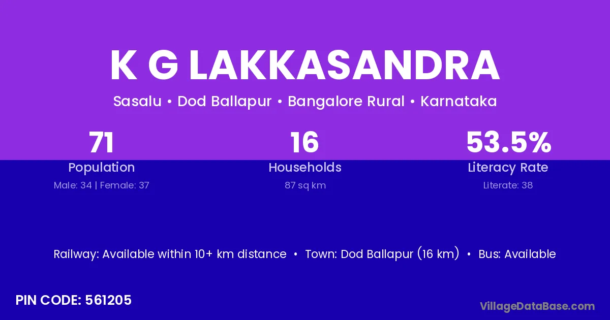 Dod Ballapur (16 km) is the nearest town to K G Lakkasandra village for major economic activities and is located approximately 16 km away.