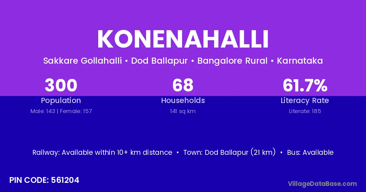 Dod Ballapur (21 km) is the nearest town to Konenahalli village for major economic activities and is located approximately 21 km away.