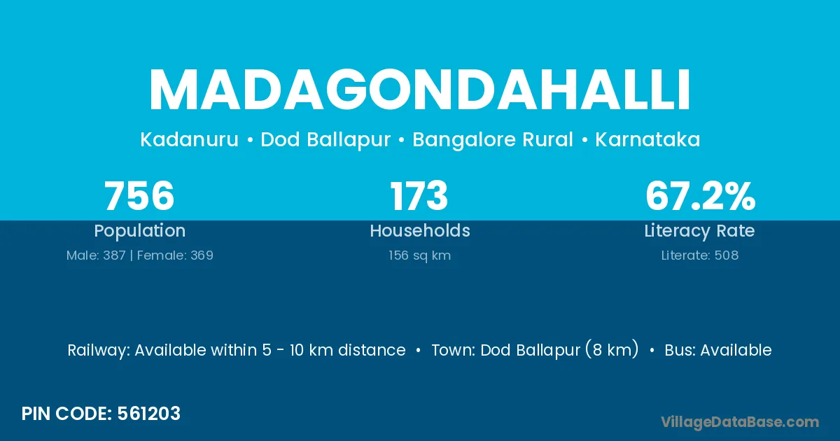 Dod Ballapur (8 km) is the nearest town to Madagondahalli village for major economic activities and is located approximately 8 km away.