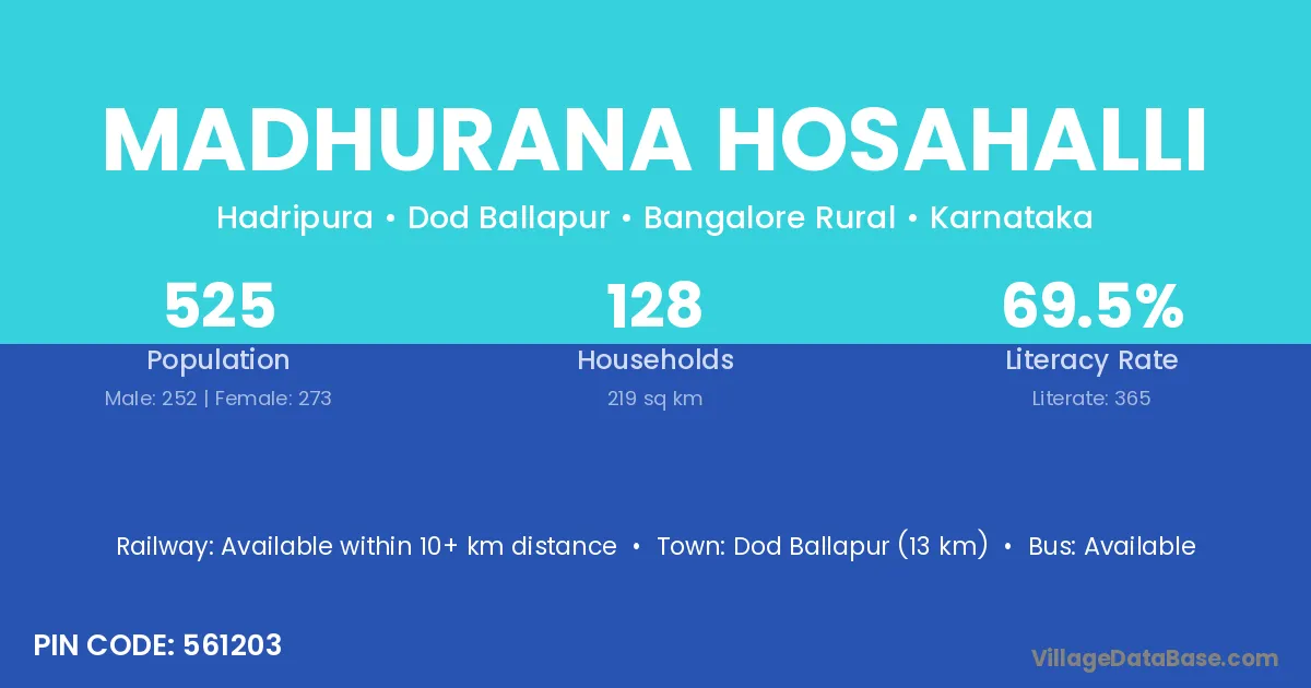 Dod Ballapur (13 km) is the nearest town to Madhurana Hosahalli village for major economic activities and is located approximately 13 km away.