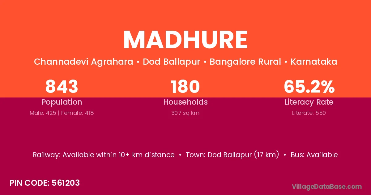 Dod Ballapur (17 km) is the nearest town to Madhure village for major economic activities and is located approximately 17 km away.