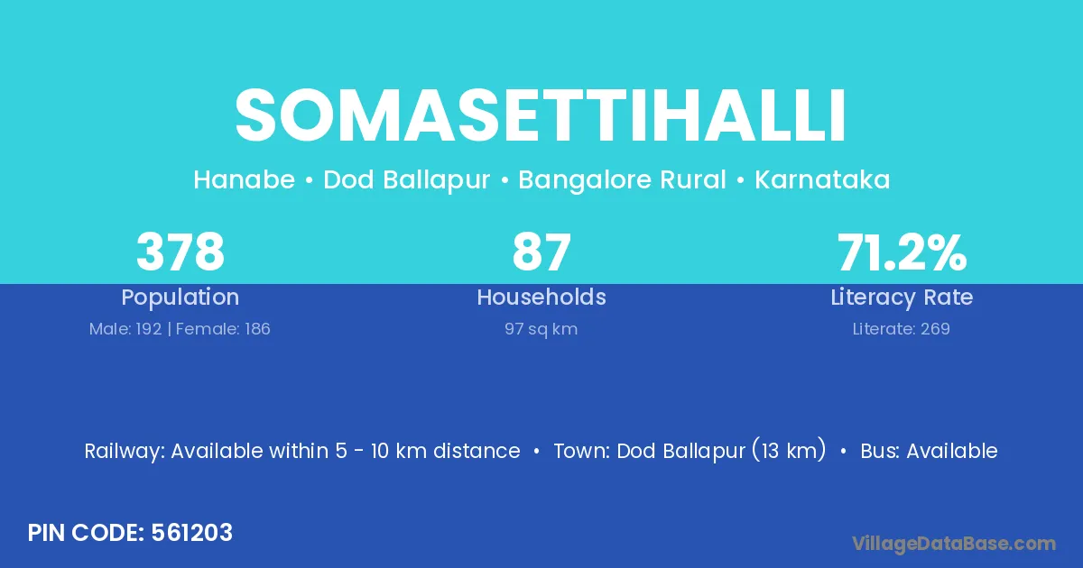Dod Ballapur (13 km) is the nearest town to Somasettihalli village for major economic activities and is located approximately 13 km away.