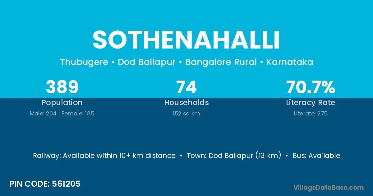 Sothenahalli village has a total population of 389 people, of which 204 are males and 185 are females.