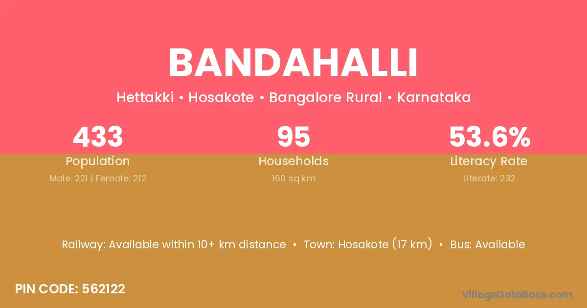 Bandahalli village has a total population of 433 people, of which 221 are males and 212 are females.