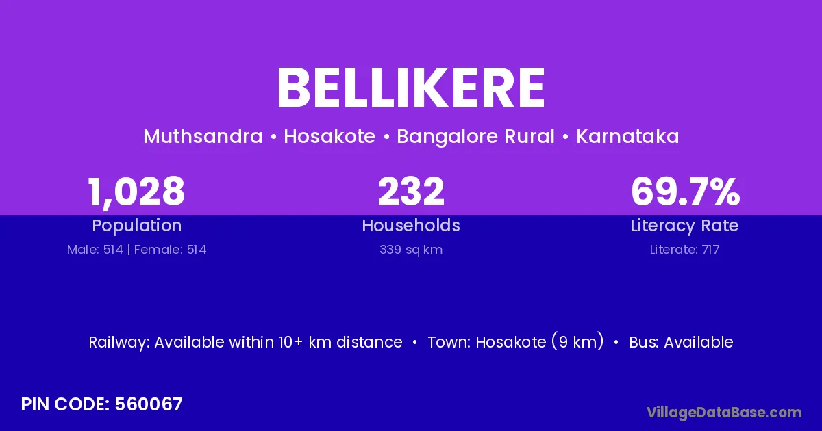 Hosakote (9 km) is the nearest town to Bellikere village for major economic activities and is located approximately 9 km away.