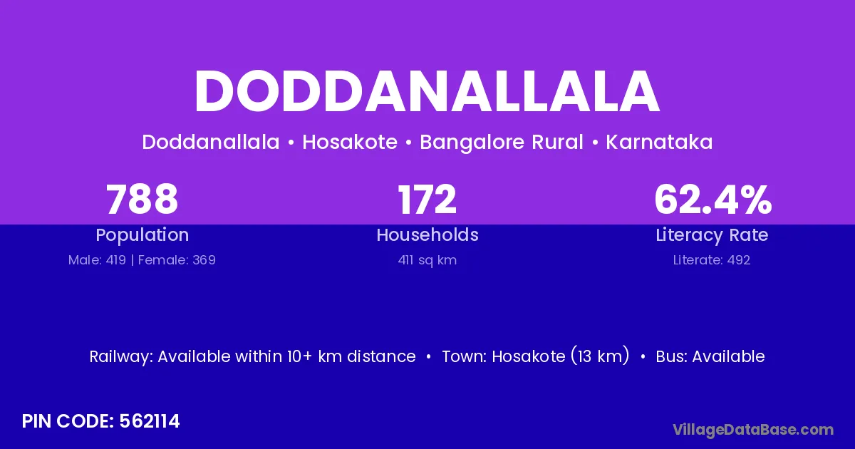 Hosakote (13 km) is the nearest town to Doddanallala village for major economic activities and is located approximately 13 km away.