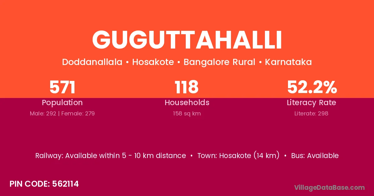 Hosakote (14 km) is the nearest town to Guguttahalli village for major economic activities and is located approximately 14 km away.