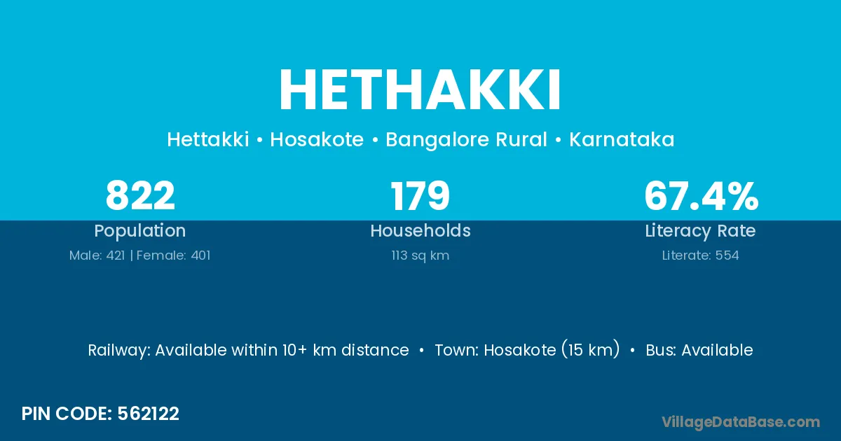 Hethakki village has a total population of 822 people, of which 421 are males and 401 are females.
