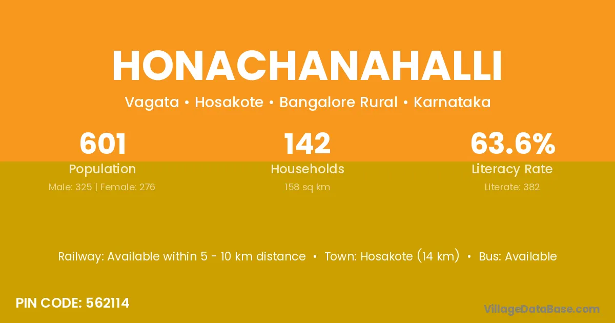 Hosakote (14 km) is the nearest town to Honachanahalli village for major economic activities and is located approximately 14 km away.