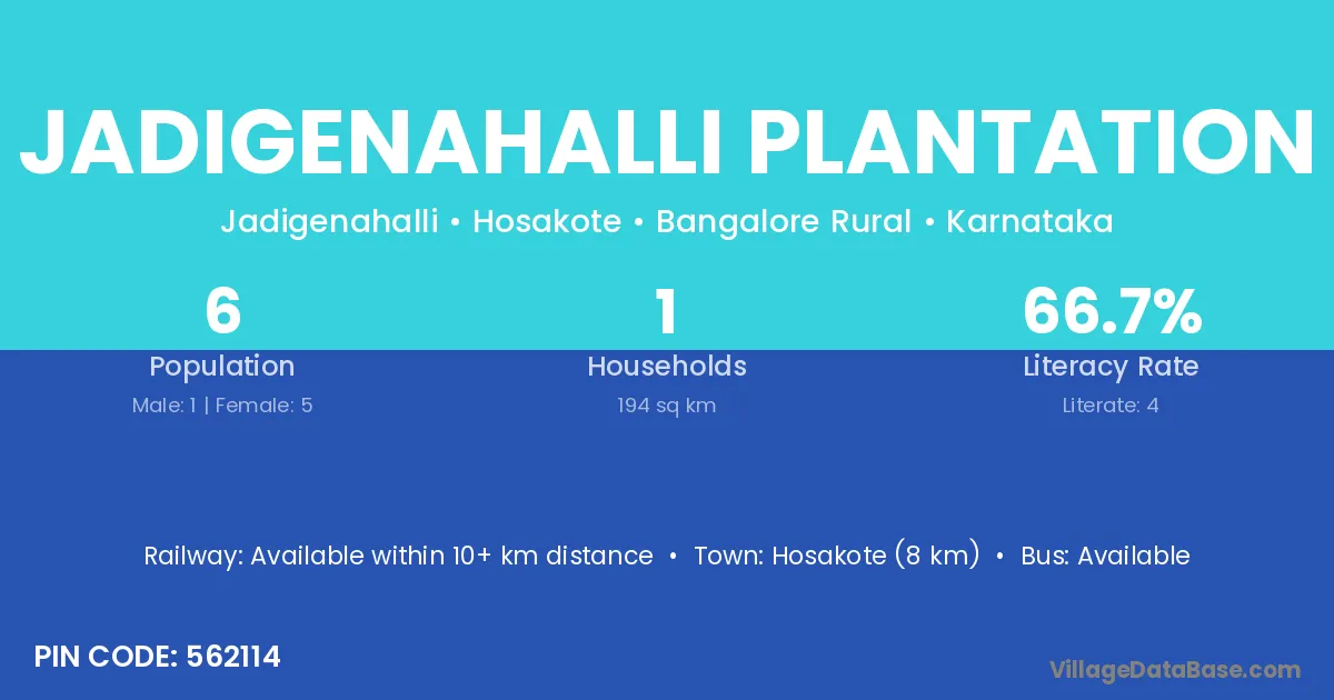 Hosakote (8 km) is the nearest town to Jadigenahalli Plantation village for major economic activities and is located approximately 8 km away.