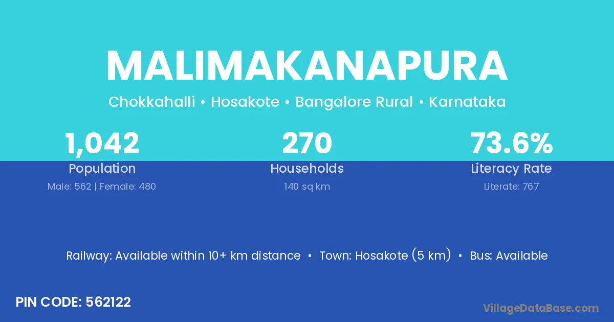 Hosakote (5 km) is the nearest town to Malimakanapura village for major economic activities and is located approximately 5 km away.
