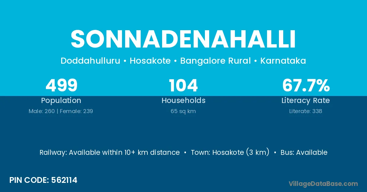 Hosakote (3 km) is the nearest town to Sonnadenahalli village for major economic activities and is located approximately 3 km away.