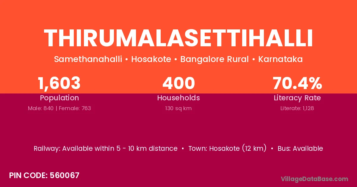 Hosakote (12 km) is the nearest town to Thirumalasettihalli village for major economic activities and is located approximately 12 km away.