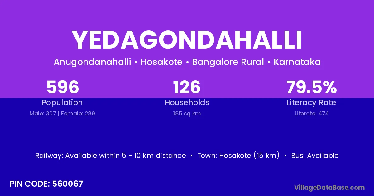 Hosakote (15 km) is the nearest town to Yedagondahalli village for major economic activities and is located approximately 15 km away.